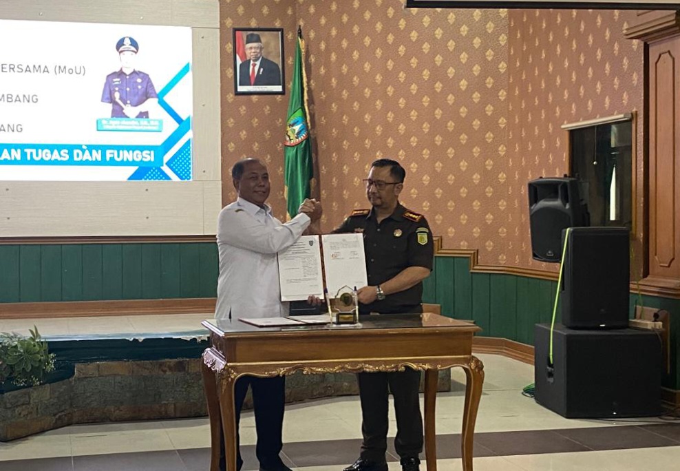 Dari sisi kiri, Pj Bupati Jombang Sugiat dan Kepala Kejaksaan Negeri Jombang Agus Chandra usai melakukan penandatanganan kesepakatan bersama