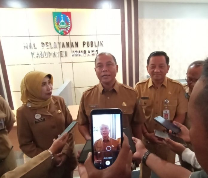 Pj. Bupati Jombang Sugiat ketika diwawancarai didampingi Setdakab Jombang Agus Purnomo dan Kepala DPMPTSP Kabupaten Jombang Wor Windari