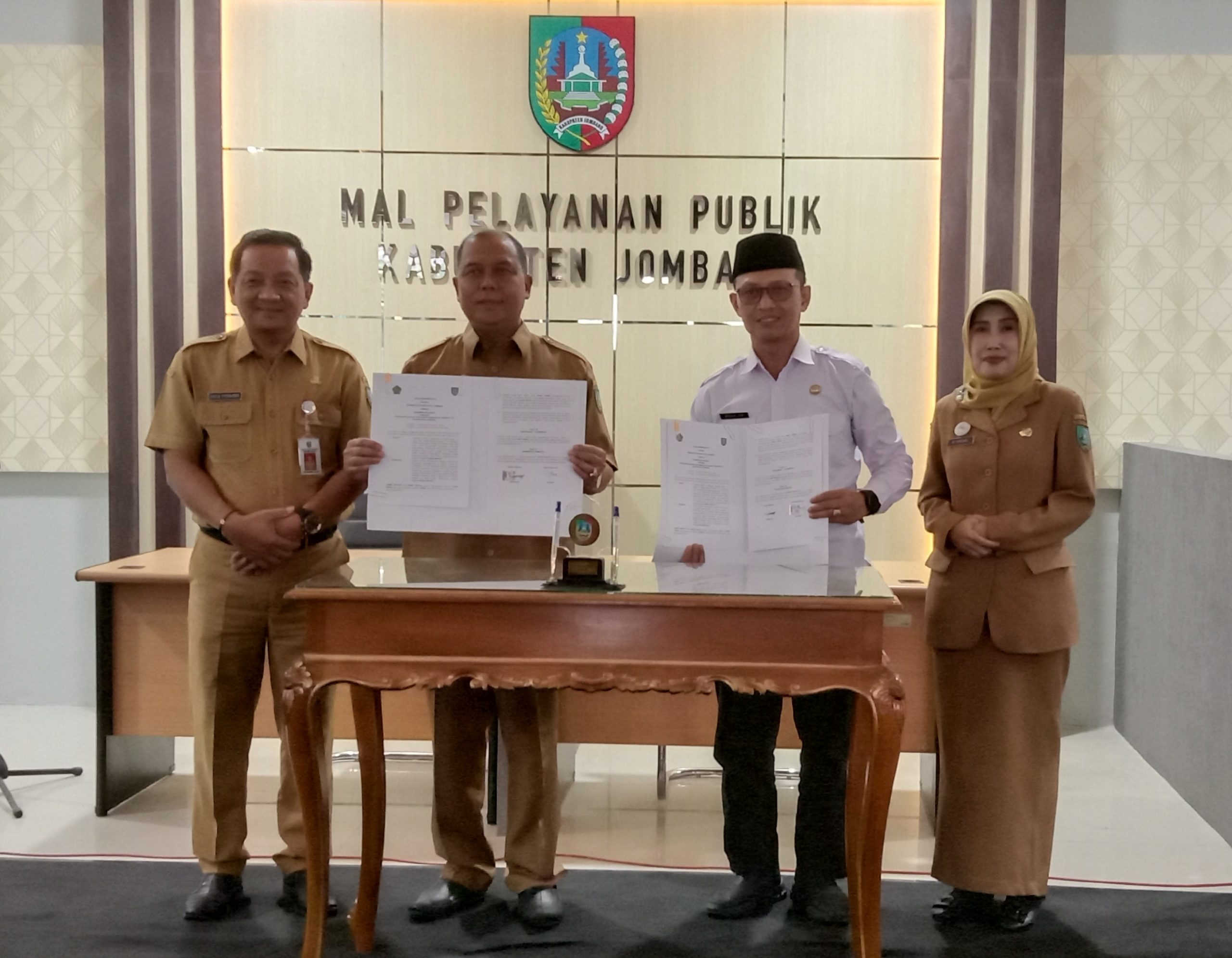 Kepala BPJS Ketenagakerjaan Kabupaten Jombang Nurhadi Wijayanto dan Kepala DPMPTSP Kabupaten Jombang Wor Windari usai menandatangani nota kesepahaman yang disaksikan langsung oleh Pj. Bupati Jombang Sugiat dan Setdakab Jombang Agus Purnomo