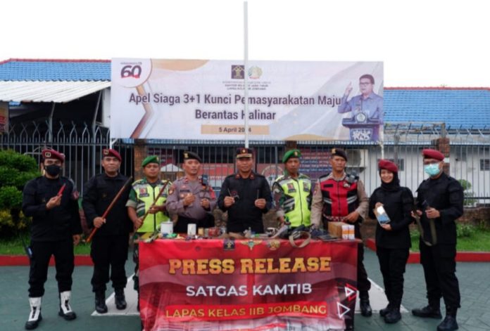 Jombang, Briannova.or.id – Dalam rangka memperingati Hari Bakti Pemasyarakatan ke-60 Tahun 2024, Lapas Kelas IIB Jombang laksanakan Apel Siaga 3+1 (Berantas Handphone, Pungli dan Narkoba) yang dirangkai dengan kegiatan razia kamar/blok hunian bersama Aparat Penegak Hukum (APH).