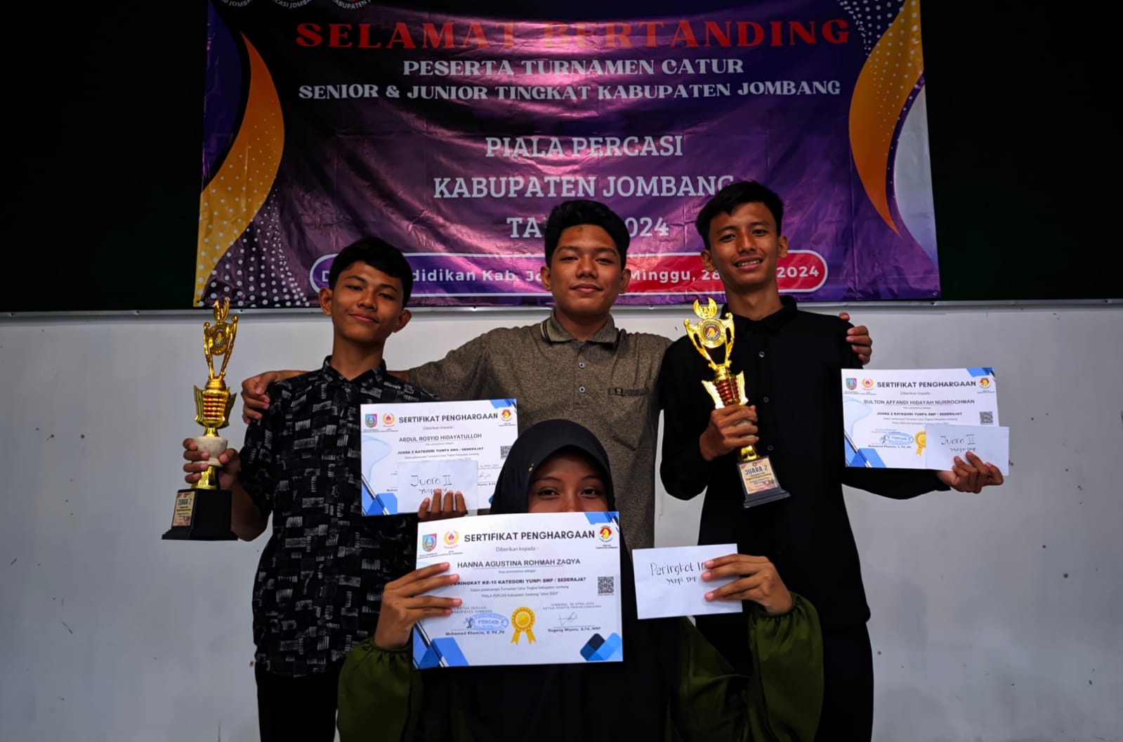 Istianah, siswi asal MTs Negeri 9 Jombang berhasil meraih Juara Pertama Yunior Putri kategori SMP dalam turnamen ini. Selain Istianah, MTs Negeri 9 Jombang juga mengirim dua siswa kelas VII (tujuh) dalam turnamen. Tujuannya, untuk memberikan pengalaman bertanding bagi mereka sebagai kesiapan untuk mengikuti lomba – lomba catur di masa mendatang. Hal ini disampaikan Kepala MTs Negeri 9 Jombang Abdul Haris ketika diwawancarai. Minggu (29/4/2024)
