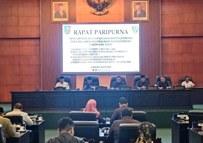 Jombang, Briannova.or.id – DPRD Kabupaten Jombang gelar rapat paripurna penyampaian nota penjelasan Bupati Jombang empat Rancangan Peraturan Daerah (Raperda) tahun 2024. Rapat dipimpin langsung oleh Ketua DPRD Jombang Mas’ud Zuremi pada Rabu (12/6/2024).