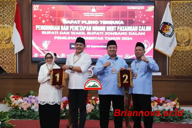 Jombang, Briannova.or.id – Pada tahap pengundian dan penetapan nomor urut pasangan calon Bupati dan Wakil Bupati Jombang dalam Pemilihan Serentak Tahun 2024, Komisi Pemilihan Umum (KPU) Kabupaten Jombang gelar rapat pleno terbuka bertempat di Gedung Pertemuan Husni Kamil Malik KPU Kabupaten Jombang.