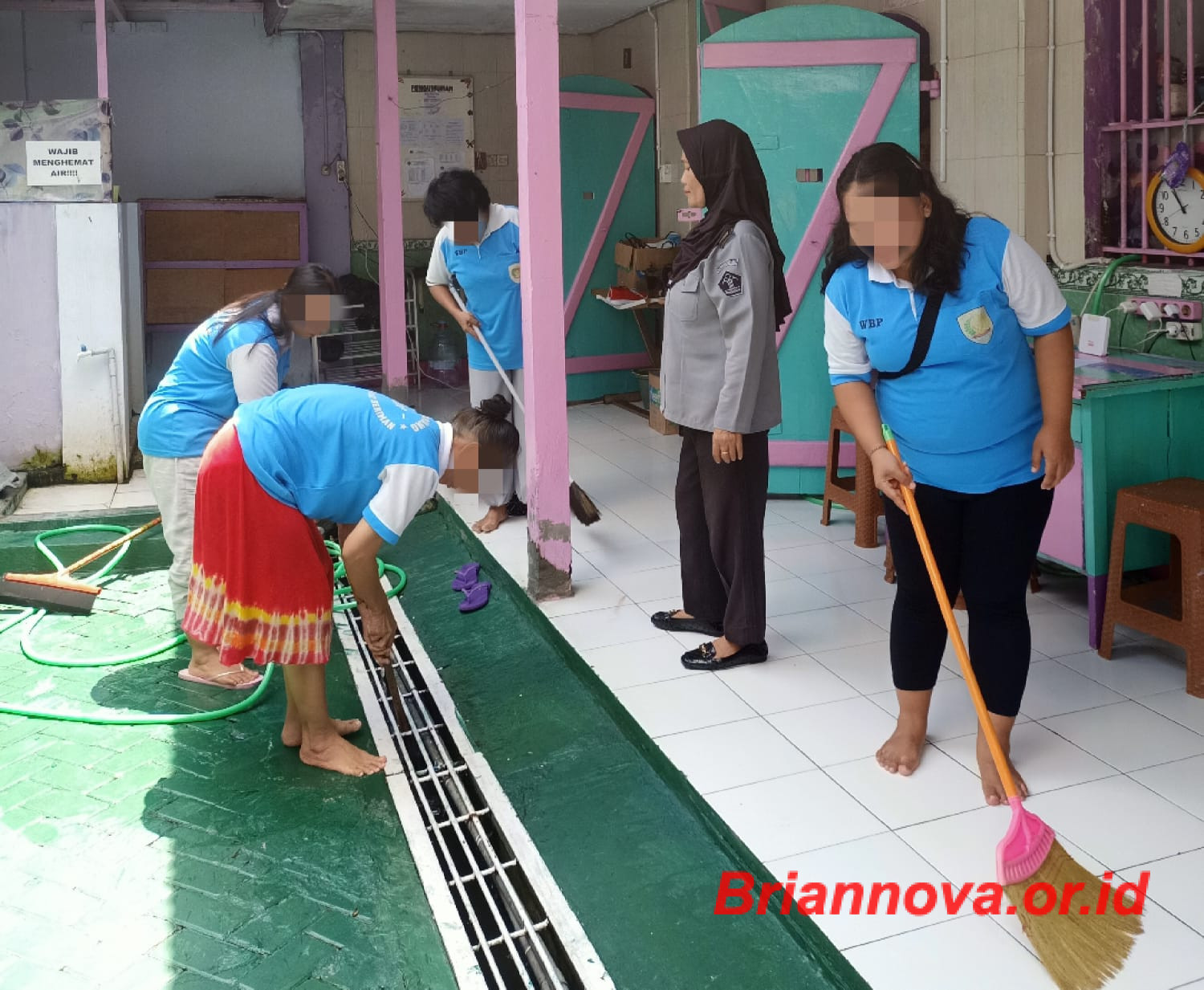 Jombang, Briannova.or.id – Dengan pengawasan petugas blok wanita, WBP wanita bergotong royong membersihkan kamar dan blok hunian wanita Sabtu Pagi (25/01/25).