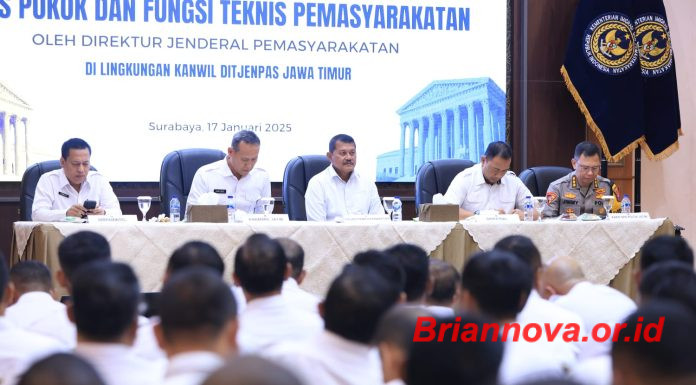 Surabaya, Briannova.or.id - Penguatan dan Pengarahan Tusi Pemasyarakatan oleh Direktur Jenderal Pemasyarakatan, Brigjen Pol. Mashudi. Beliau didampingi oleh Kakanwil Ditjenpas Jatim Kadiyono, Direktur Kepatuhan Internal Lilik Sujandi, Direktur Pengamanan dan Intelijen Tatan Dirsan Atmaja pada Jumata (17/01/25) , bertempatdi...