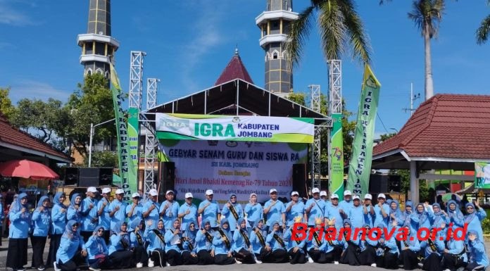 Jombang, Briannova.or.id - Salah satu rangkaian kegiatan dalam rangka Hari Amal Bhakti Kementrian Agama ke-79 tahun 2024, Kementerian Agama Kabupaten Jombang gelar Gebyar senam guru dan siswa Raudhatul Athfal (RA) se-Kabupaten Jombang.